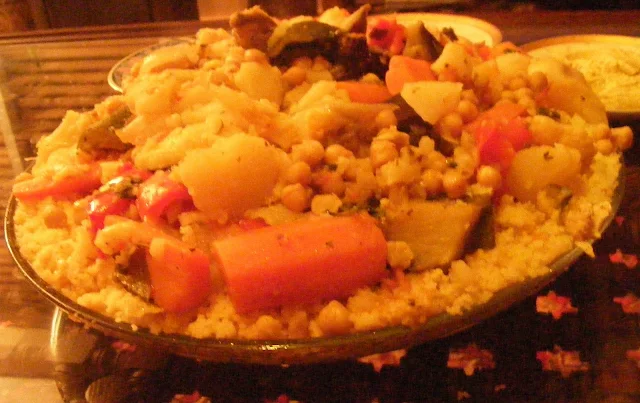 Introduce the couscous in a large bowl, separate the sauce and vegetables. Arrange vegetables on couscous. Serve the broth in a separate bowl.